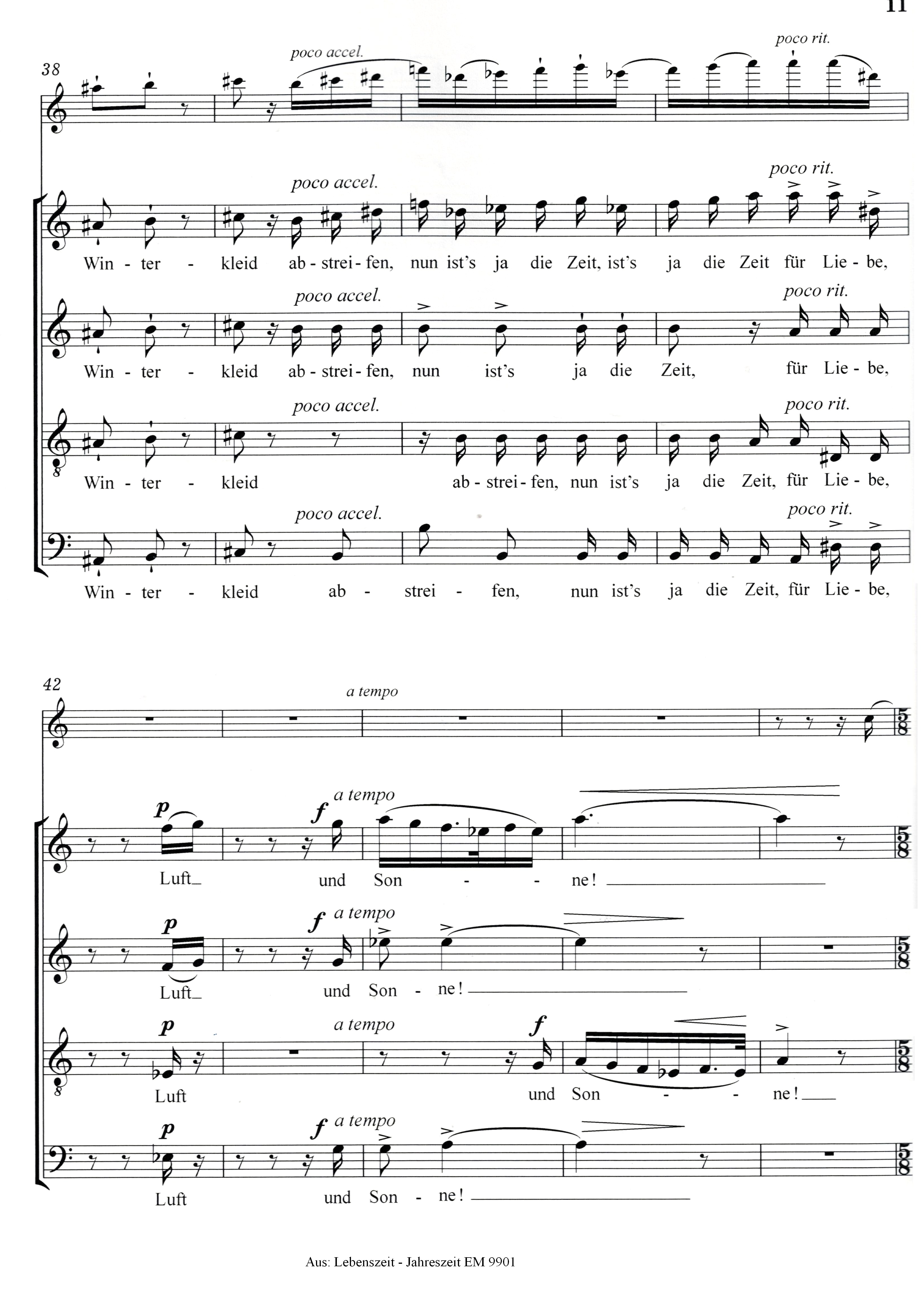 Cantata for Mixed Choir and Obbligato Flute op. 100 The impressive, evocative poems by G. Trakl, M. Herrmann-Neiße, Chr. Michel, and from the Antwerp Songbook of 1544 are set to free tonal counterpoint, creating a rich and vibrant sound experience. The choir is accompanied by a solo flute part, which, whether preluding, connecting or intensifying, presents the performer with rewarding challenges. Score and Flute part € 20.00